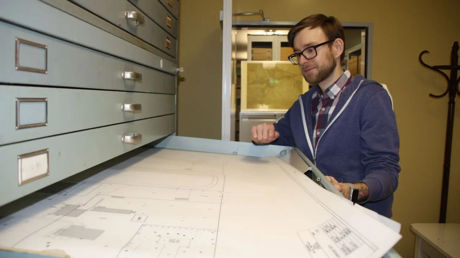 Neuerwerb: Der alte Kartenschrank aus dem ehemaligen Landbaukombinat Angermünde hat jetzt im Stadtarchiv einen neuen Platz gefunden, inklusiver Dutzender alter Bauzeichnungen. Stadtarchivar Steve Schmidt sichtet die Unterlagen.