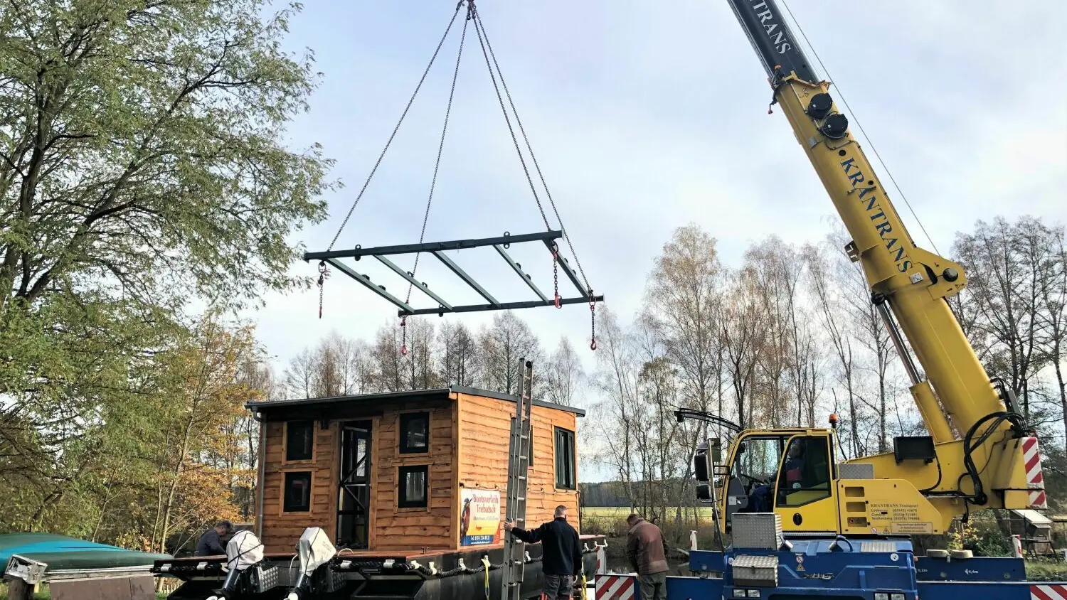Um das Hausboot sicher transportieren zu können, wird eine Traverse montiert, die für die nötige Stabilität sorgt.