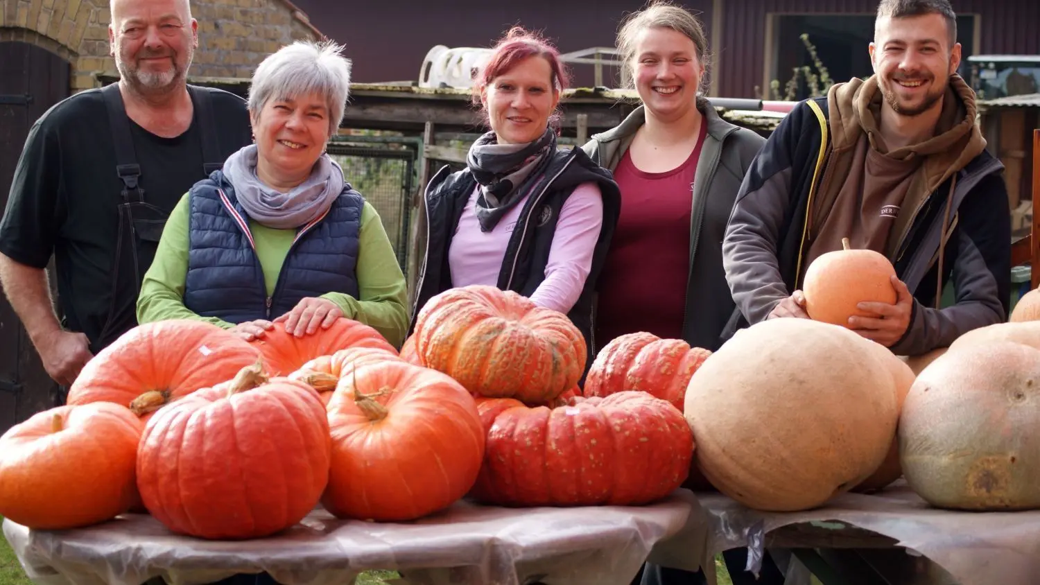 Familie Hübner im Hof vor dem Laden, von links nach rechts: Karsten, Babette Hübner, Stefanie Pichottky, Josefine Hübner, Paul Hübner.