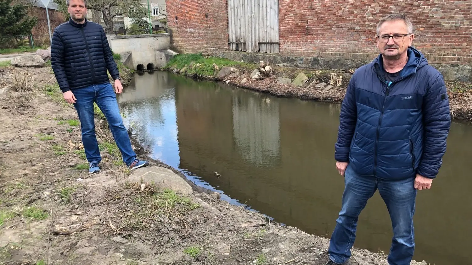 Biesenthals Bürgermeister Carsten Bruch und Ortsvorsteher Detlef Matzke vor dem Dorfteich in Danewitz