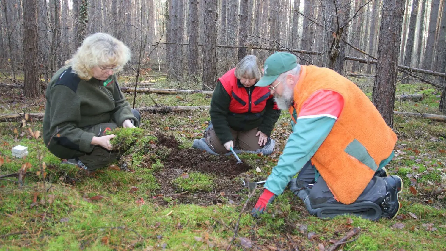 Suche im Winterboden: Im Wald in der Nähe des Dewinsees sammeln Birgit Großmann, Annette Wartenberg und Helmut Nitschke (v.l.) Puppen von Schadinsekten ein.