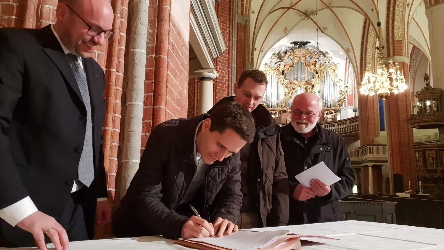 Im Oktober 2018 hatte Matthias Schuke (r.) den Traditionsbetrieb seinen beiden Söhnen Michael und Johannes übergeben, die im November sogleich einen mächtigen Auftrag unterzeichnen konnten – für die neuen Klangdimensionen in der St. Katharinenkirche. Pünktlich zum 200. Firmenjubiläum ist das Prachtwerk vollbracht und erlebba