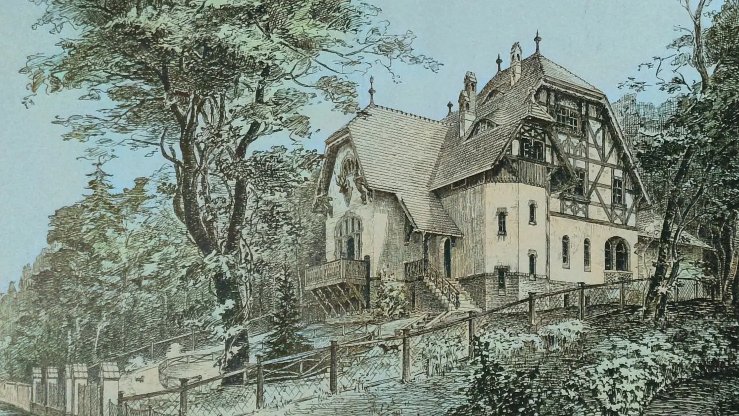 Abbildung des früheren Casinos der "Akademischen Gesellschaft vom Deutschen Hause" in der Brunnenstraße 6 in Eberswalde, die 1894 in der Deutschen Bauzeitung veröffentlicht wurde. Das Bild wurde von Frank Kemper nachkoloriert.