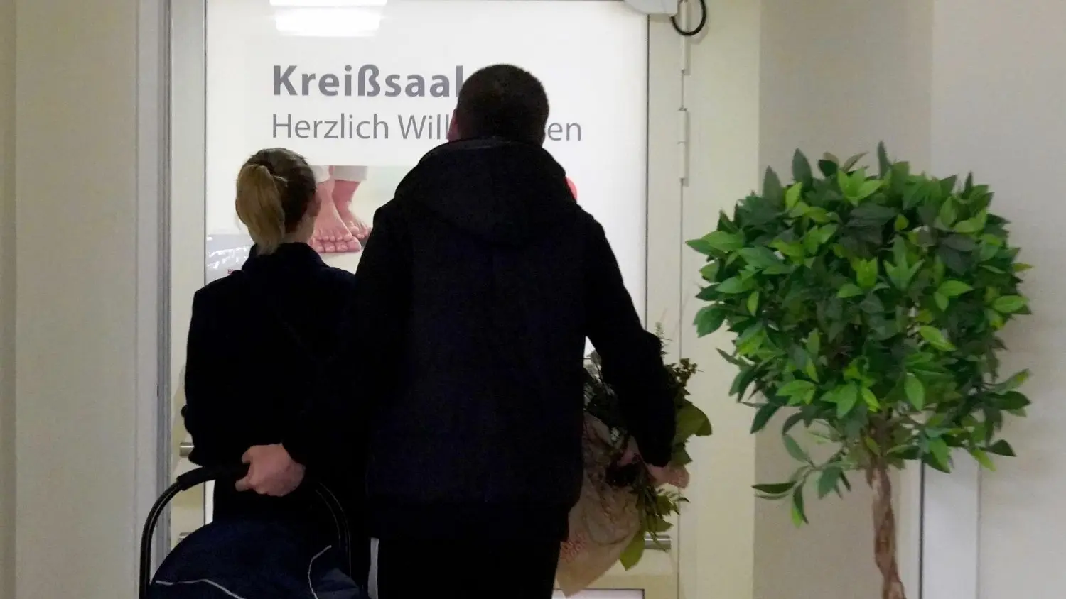 Eine Frau und ein Mann gehen mit einem Baby in den Kreißsaal eines Krankenhauses (Symbolbild). Der Kreißsaal in Eisenhüttenstadt bleibt nun erst einmal längere Zeit geschlossen.