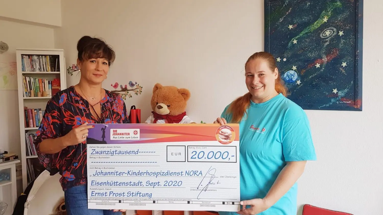 Johanniter-Unfall-Hilfe e.V.Mit 20.000 Euro unterstützt die Ernst-Prost-Stiftung erneut den Kinderhospizdienst „NORA“ der Johanniter Unfallhilfe. Am Montag überreichte Kerstin Thiele, Stiftungsmanagerin und Ehefrau des Stiftungsgründers Ernst Prost, einen symbolischen Scheck an Eilen Samol, Koordinatorin des Kinderhospizdienstes. „Dienste, wie der Kinderhospizdienst werden gebraucht und benötigen Unterstützung und Vertrauen, um Bedürftigen helfen zu können“, betonte Kerstin Thiele bei der Übergabe des Schecks.