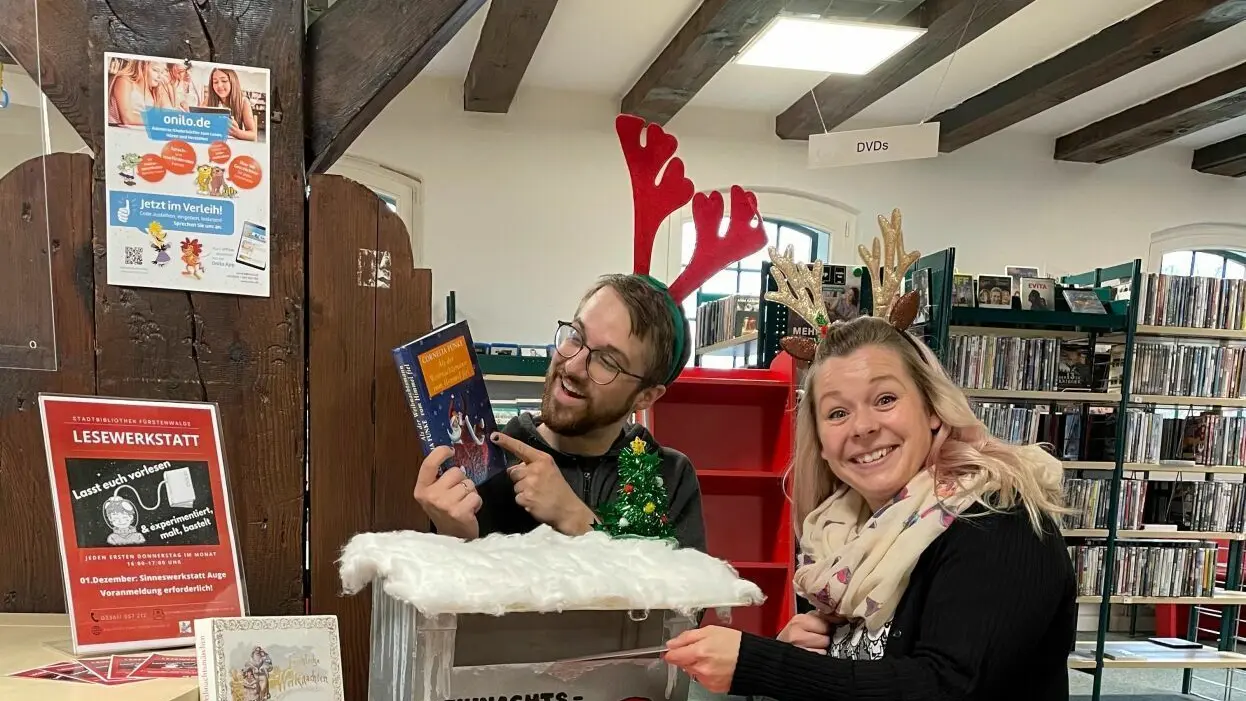 Pascal Gräfe, Mitarbeiter der Bibliothek, und Christine Wander, Sachbearbeiterin im Fürstenwalder Amt für Soziales, Kultur und Sport am Wunschbriefkasten in der Stadtbibliothek Fürstenwalde.
