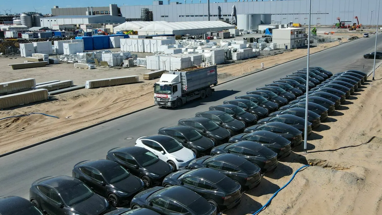 Elektrofahrzeuge vom Typ Tesla Model Y stehen auf dem Werksgelände der Tesla Gigafactory in Grünheide bei Berlin. Für die Fabrik werden Mitarbeiter gesucht. Was zahlt Tesla?