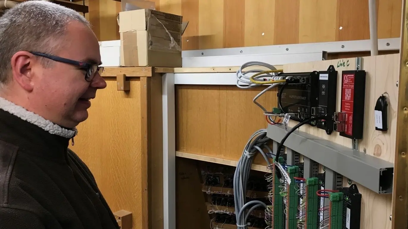 Vincent Schaper von der Fachfirma, die die Modernisierung der Orgel im Dom Fürstenwalde geplant hat, schaut auf die Steuerzentrale.