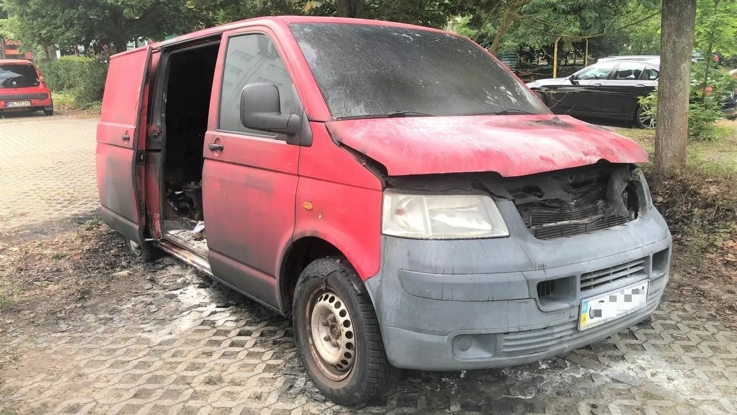 Ein in Brand gesteckter Kleintransporter auf dem Parkplatz des Einkaufszentrums Heidewald an der Frankfurter Allee in Eberswalde.