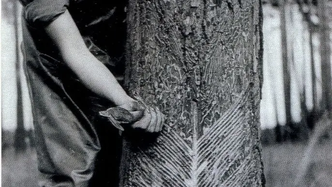 Anstrengend: Im Fischgrätenverfahren zieht diese Harzerin mit einem Handhobel eine Schnittrille. Die Harzgewinnung wurde in der DDR bis zur Wende betrieben, dann aber wegen Unwirtschaftlichkeit eingestellt.