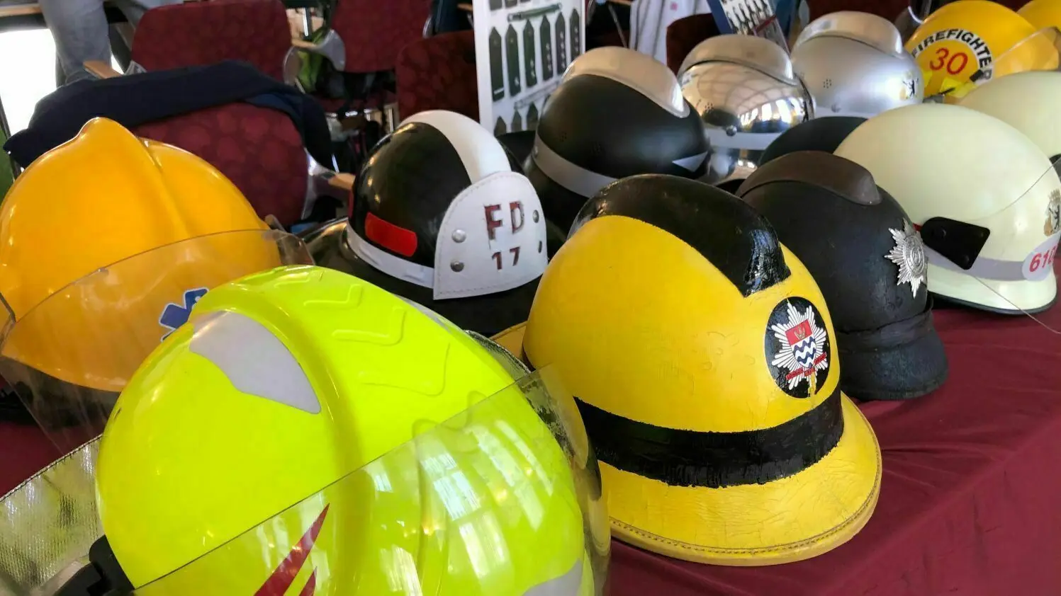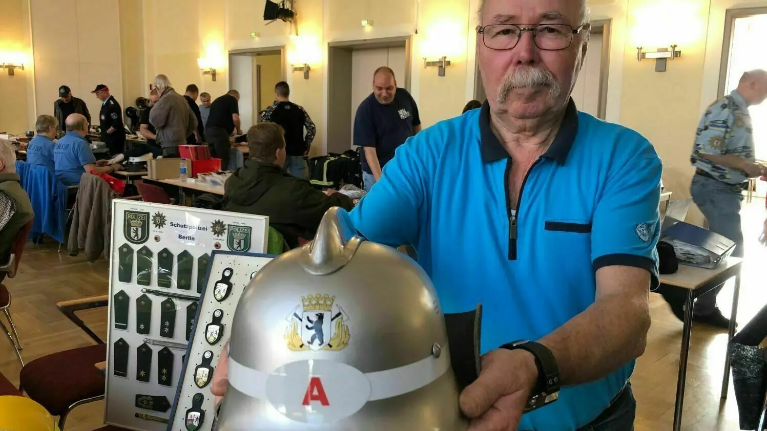 Die Leidenschaft 74-jährige Michael Kupczyk aus Berlin sind Feuerwehrhelme. Eine kleine Auswahl seiner 200 Stück hat er aufgestellt. Die anderen hängen beim ihm Zuhause im Keller. Seit den 80er-Jahren sammelt er Feuerwehrhelme der Wachen in der Hauptstadt. Aber auch Replikate von US-Polizeiabzeichen bot er an.