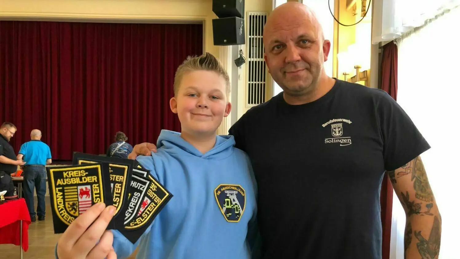 Der elfjährige Nicklas Eckhoff aus Solingen ist ein Abzeichenjäger. Seine Sammlung von Feuerwehr-Abzeichen ist groß. Er hat zu Hause in Solingen mehr als 13.000 Abzeichen. Rechts sein Vater Christian. Er ist Feuerwehrmann, wie sein Vater es war.