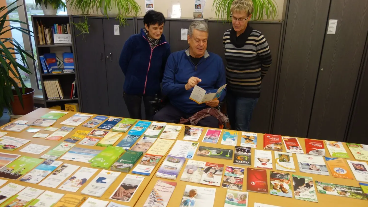 Der Tisch im KOMM liegt voller Flyer mit Hilfsangeboten. Doch niemand darf herein, bedauern Anke Meyer, Heinz Strüwing und Ramona Wenngatz (v.l.). Für die Fotosekunden haben sie die Masken abgenommen.