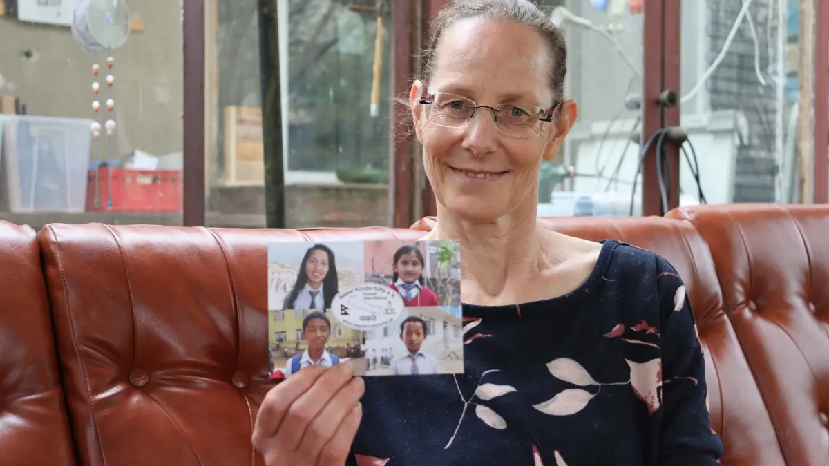 Nicolle Range in Petershagen mit einer Karte der Nepal Kinderhilfe. Seit 2022 gehört sie zum Leitungsteam des Vereins, der mit Bildung Zukunftschancen eröffnet.