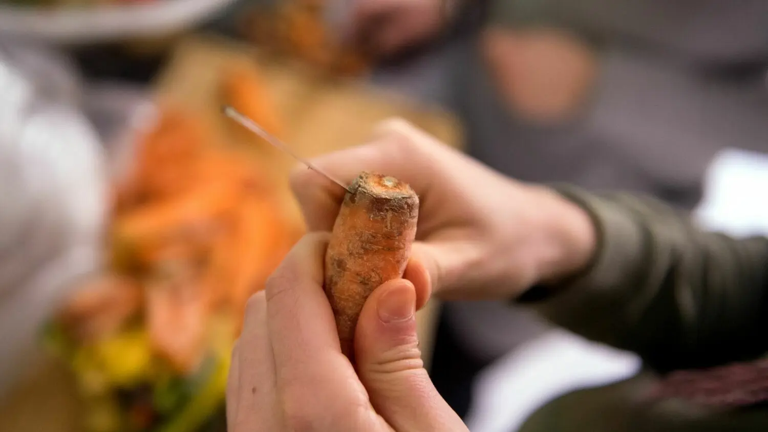 Karotte zu schrumpelig? Nein, eine Köchin schneidet in Berlin-Kreuzberg die „unbrauchbaren“ Stellen von einer welken Mohrrübe ab. Das spart Abfall und bares Geld.