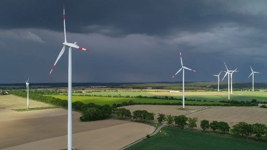 Vogelperspektive: Dunkle Gewitterwolken ziehen über die Landschaft mit Windenergieanlagen vom Energiepark "Odervorland" in Sieversdorf (Oder-Spree).