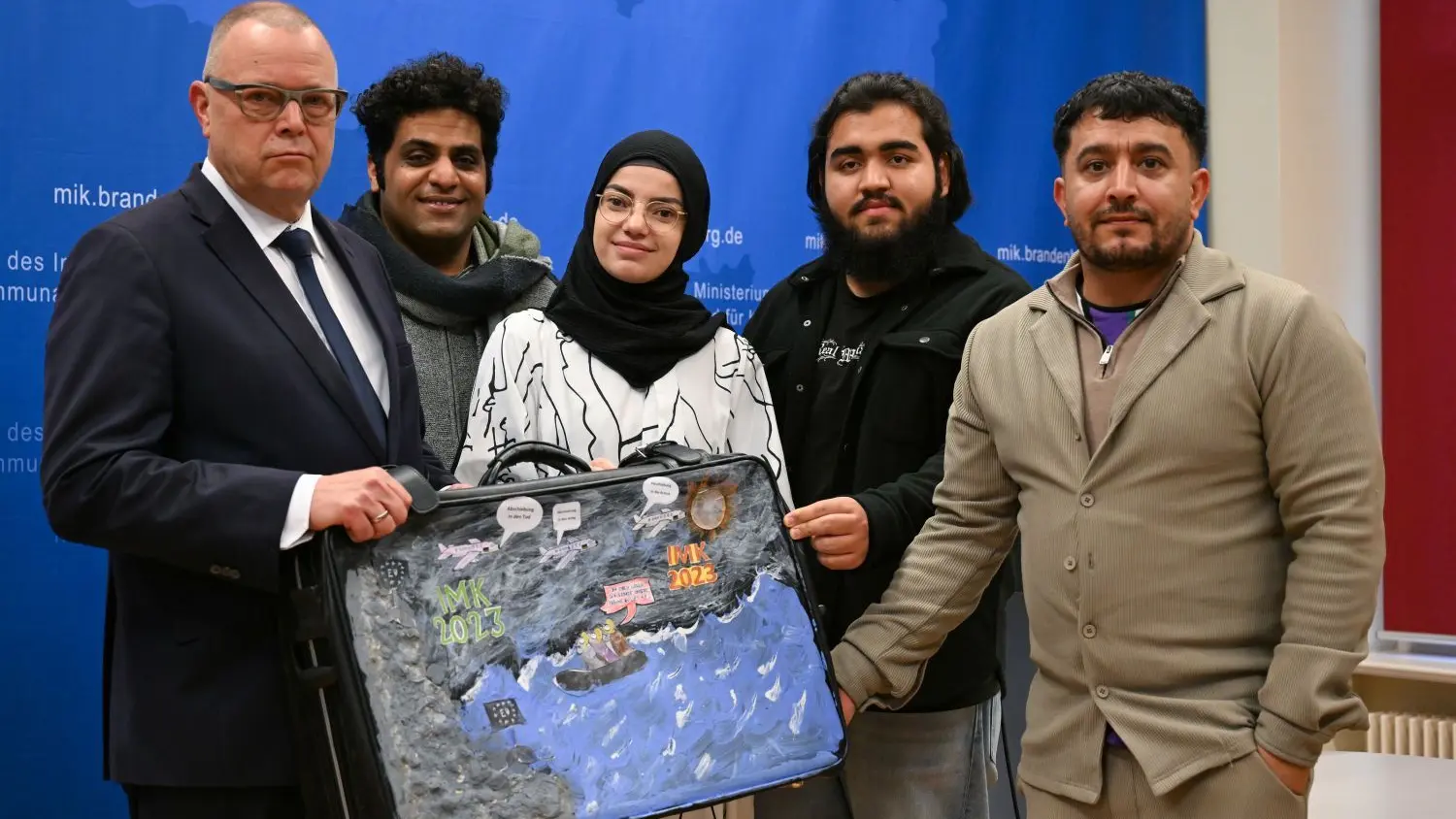 Ein Koffer, auf dem ein Flüchtlingsboot zu sehen ist, fungiert als Negativpreis für den „Abschiebeminister 2023“. Brandenburgs Innenminister Michael Stübgen nahm ihn am Donnerstag (26. 10.) von Jibran Khalil aus Pakistan, Hayere Khan aus dem Kosovo, Wahed Khan und Mati Karimi (beide Afghanistan) von der Initiative «Jugendliche ohne Grenzen» in Potsdam entgegen.