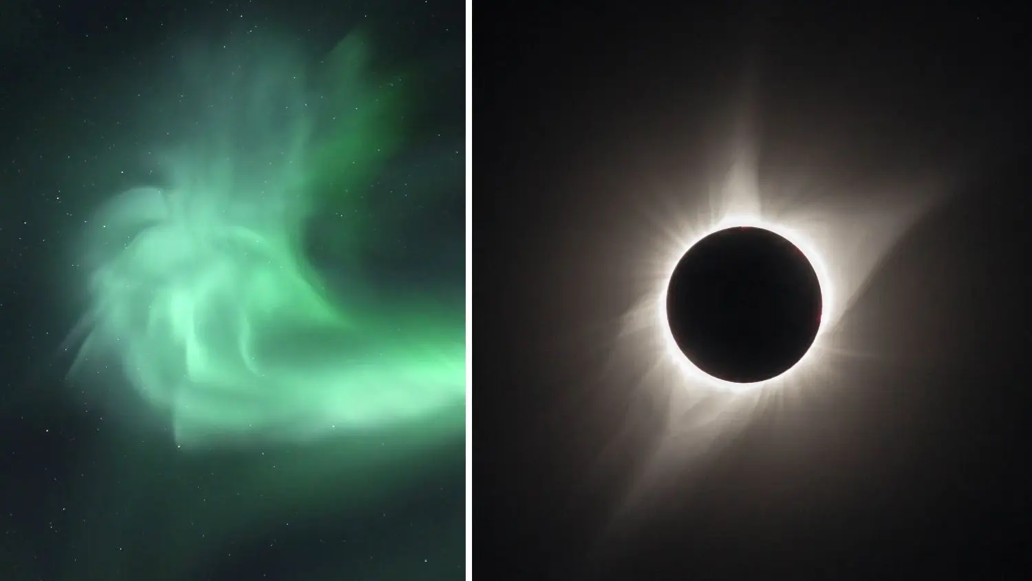 Eine Polarlicht-Korona über den Lofoten (li.) und die Sonnen-Korona während der totalen Sonnenfinsternis im August 2017.