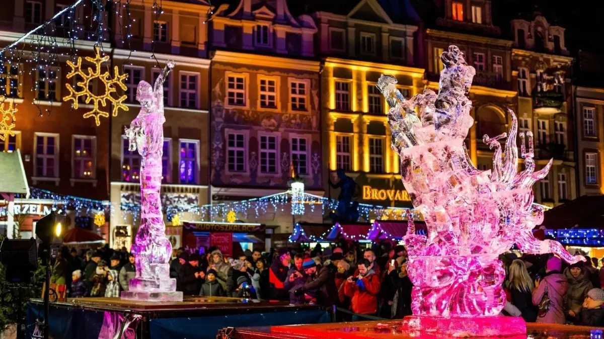 Das Eisskulpturen-Festival in Posen. Es findet jedes Jahr während der Vorweihnachtszeit statt und ist fester Programmbestandteil des Weihnachtsmarkts.