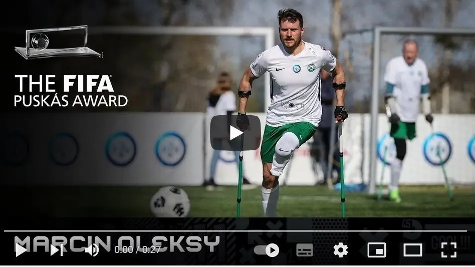 Am Montag (27. Februar) hingegen stand Oleksy in Paris auf dem Roten Teppich der FIFA-Fußballgala und nahm den Ferenc-Puskás-Preis für das schönste Tor des Jahres entgegen: ein spektakulärer Fallrückzieher – erzielt als Einbeiniger auf Krücken.