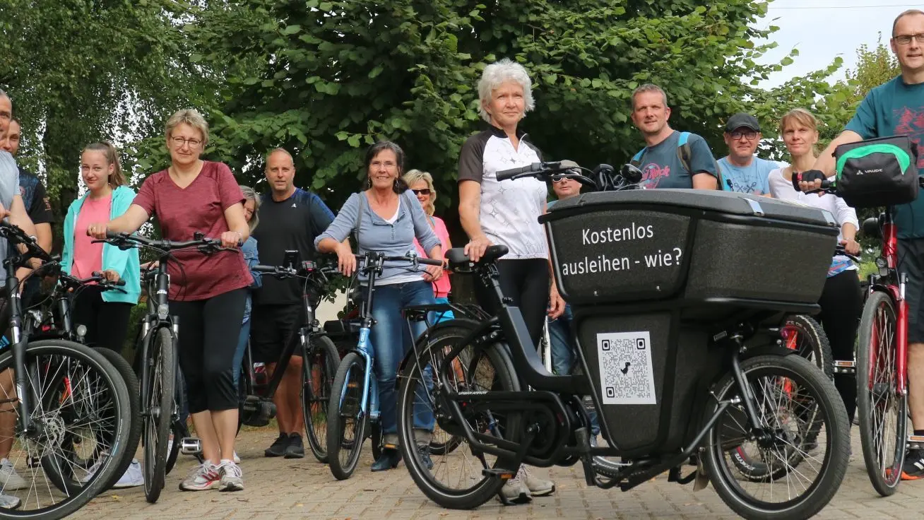 Da passt viel rein: Das neue Lastenrad des Dolgeliner Seniorenvereins kann kostenfrei ausgeliehen werden. Christina Helbig (vorn links) hat es auf einem Ausflug des Sportvereins aus dem Ort vorgestellt.