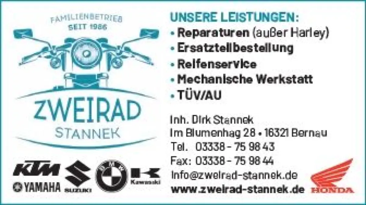 Rot-blau-weiß leuchtet die Signatur „Zweirad-Stannek“ über der Werkstatt Im Blumenhag in Bernau. Vor dem Eingang warten Roller, Mopeds und Motorräder auf ihre Inspektion, den TÜV oder die große Reparatur zum Saisonstart. In der Werkstatt herrscht geschäftiges Treiben.