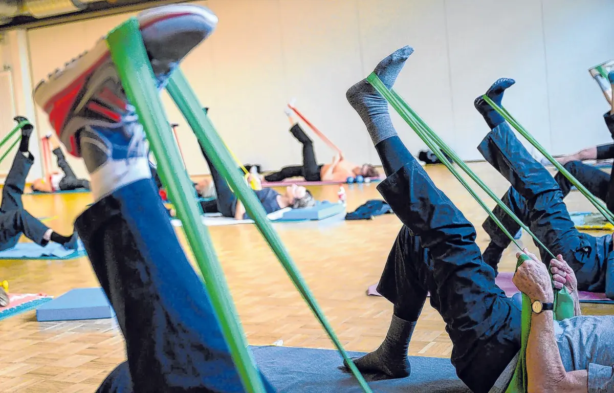 Sebastian GollnowMit schwingenden Armen durch die Halle spazieren oder „Rudern“ mit dem Gymnastikband: Wer zum Herzsport geht, kann dort eine Mischung aus Ausdauer- und Krafttraining erwarten. Auch Koordination und Beweglichkeit werden geübt. Und zwar alles so dosiert, dass das Training das Herz zwar fordert, aber nicht überfordert.