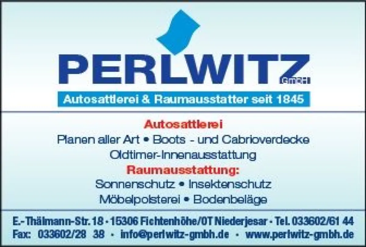 Während der Firmengründer vor mehr als 180 Jahren mit dem Bau von Postkutschen und reinen Sattlerarbeiten begonnen hatte, ist die heutige Perlwitz GmbH ein modernes, breit aufgestelltes Unternehmen. Die Palette dessen, was angeboten wird, reicht von der Möbelpolsterei über Raumgestaltung, das Verlegen von Fußbodenbelägen bis zum Anfertigen von Planen, Cabrioverdecken und vielem mehr.