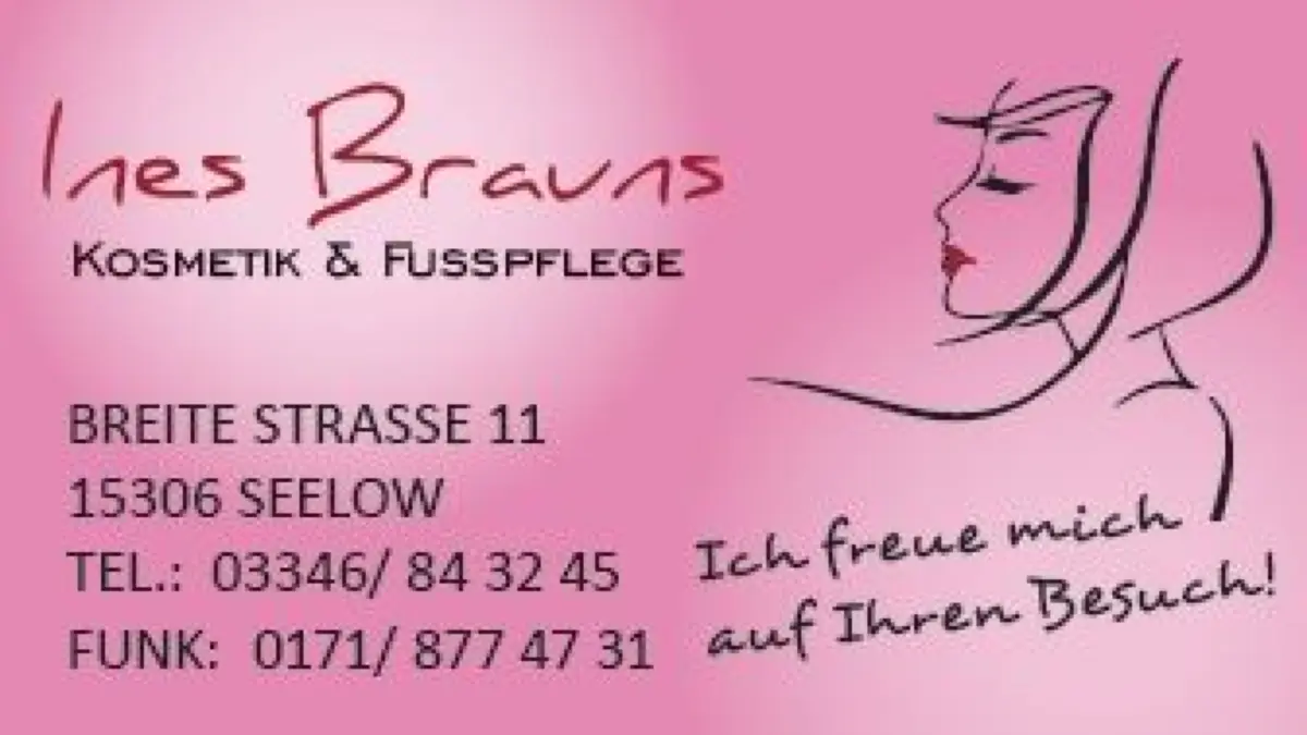Kontakt: Kosmetik und Fußpflege Ines Brauns, Breite Straße11, 15306 Seelow, Tel: (03346) 84 32 45.